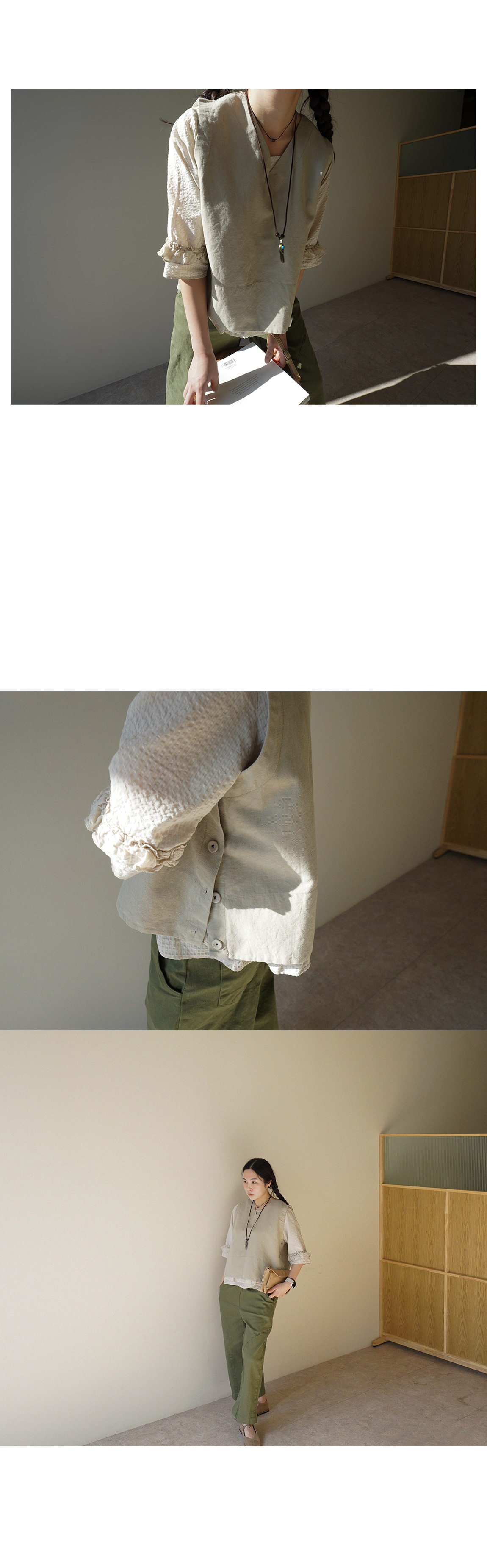 비침(화이트만) △ l 신축성 ○ l 두께감 △ l 안감 X l 광택 X