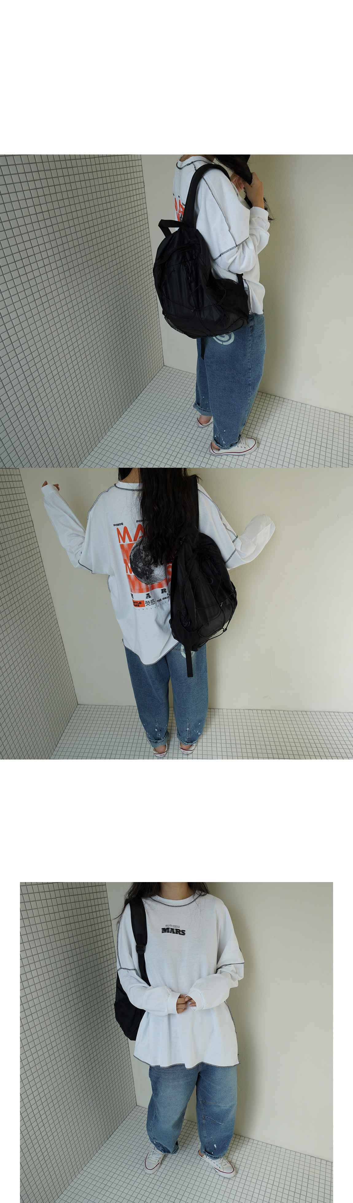 비침(화이트만) △ l 신축성 ○ l 두께감 △ l 안감 X l 광택 X